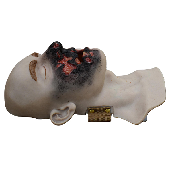 The face is easily removable for access to or replacement of, the jaw and airway. The front skull holds the airway assembly and jaw in a “muzzle” fixture system.