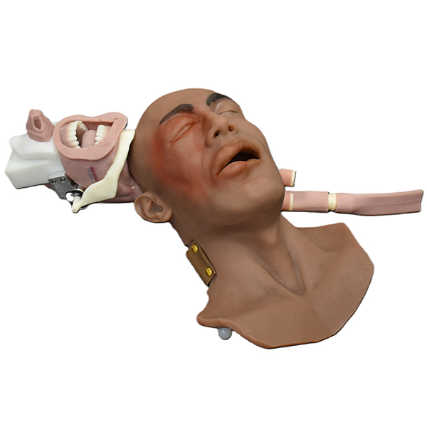 7S³ has created the first and only anatomically accurate unique pathology for edema Associated with airway obstruction. The 7S³ modular airway training system is unparalleled in its attention to details that assist the health care practitioners in providing superior patient care and experience in successful intubation. The 7S³ adult airway emulates that of a patient with anaphylaxis or partial angioedema with swelling of the eyes, lips, and tongue. The internal airway includes swollen epiglottis and uvula. The face is easily removable for access to or a replacement of the jaw and airway.